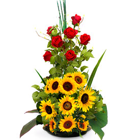 – 12 girasoles, 10 rosas rojas, drasenias, flores decorativas y follaje.