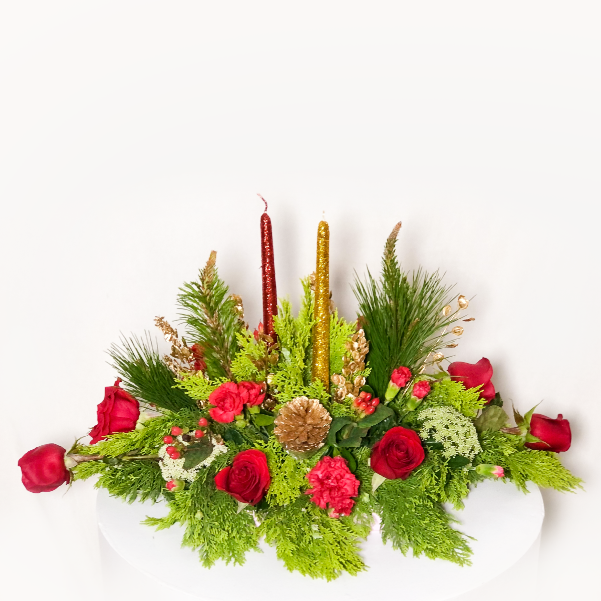 centro de mesa 01 *Que incluye* rosas importadas flores navideñas velas escarchadas pino navideño (la imagen es referencial)
