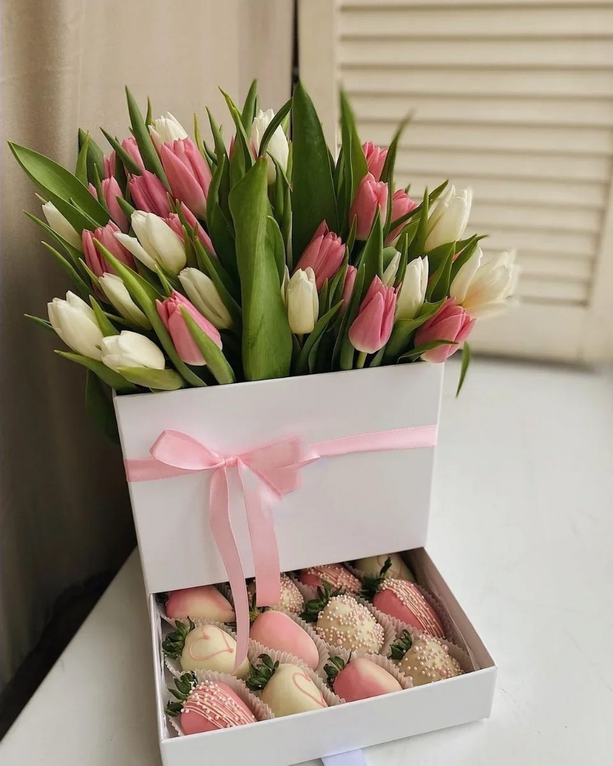 Hermoso Super Box de Tulipanes con fresas de chocolate
